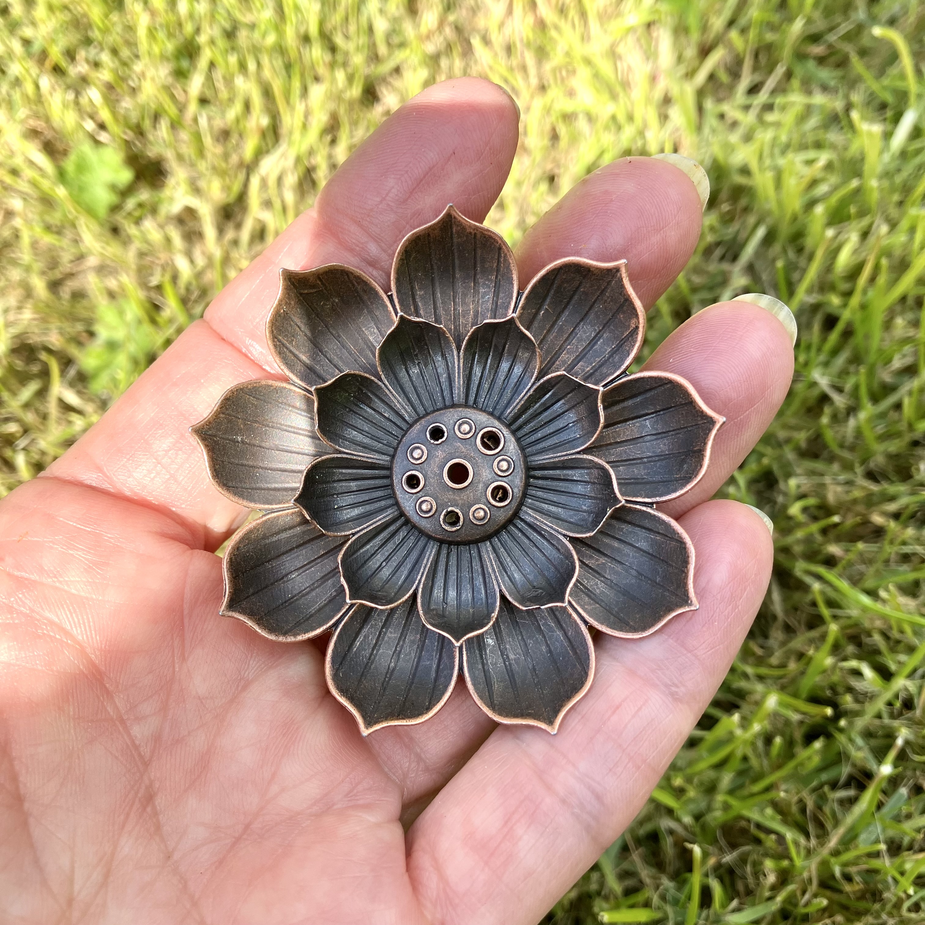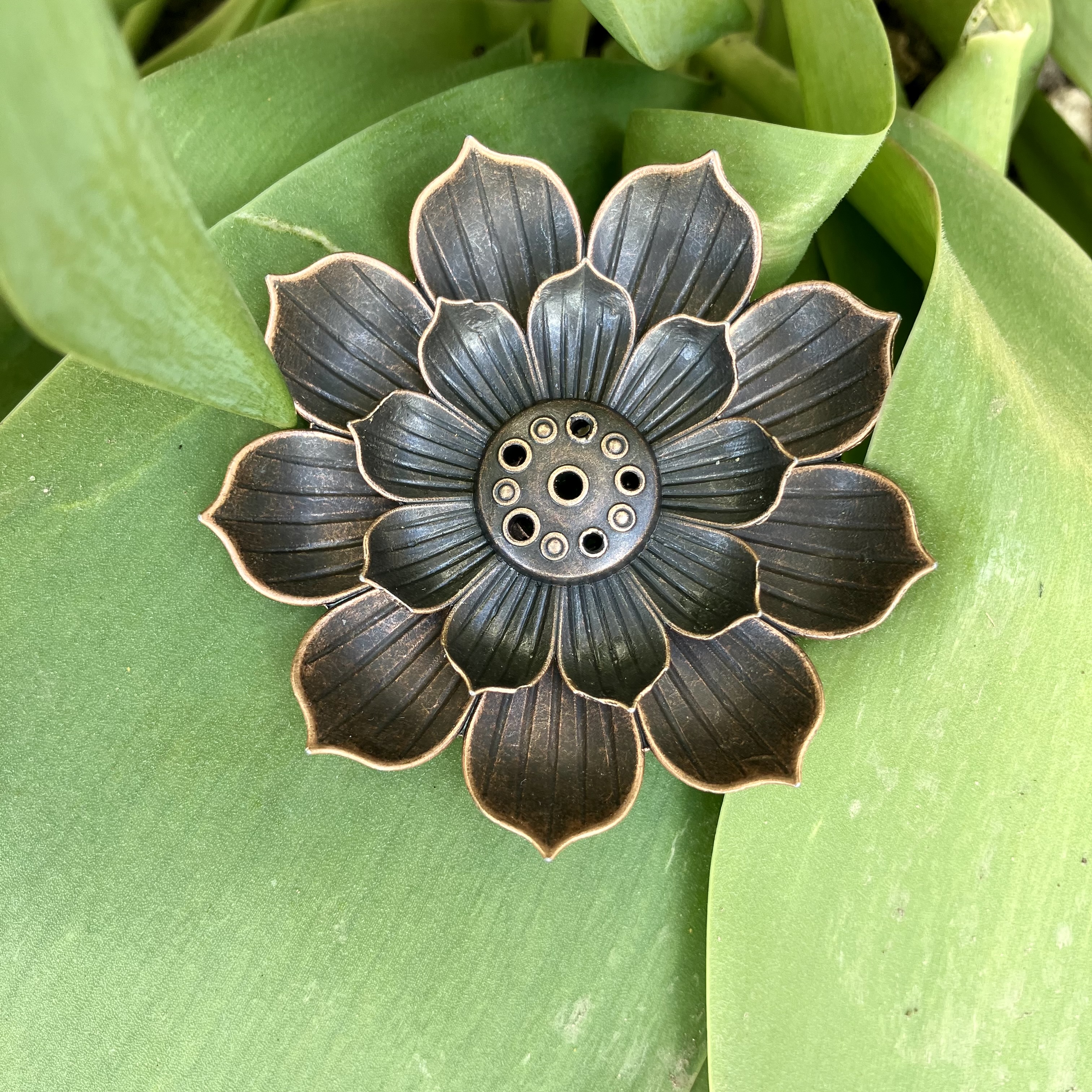 Vores røgelsesholder har en diameter på 5,8 cm og er ideel til at placere på dit skrivebord, natbord eller i stuen. Den fine udformning, inspireret af lotusblomsten, bidrager til en atmosfære af ro og harmoni i dit rum. Den smukke bronzefarve giver et tidløst og sofistikeret udtryk, der passer perfekt ind i enhver indretning.