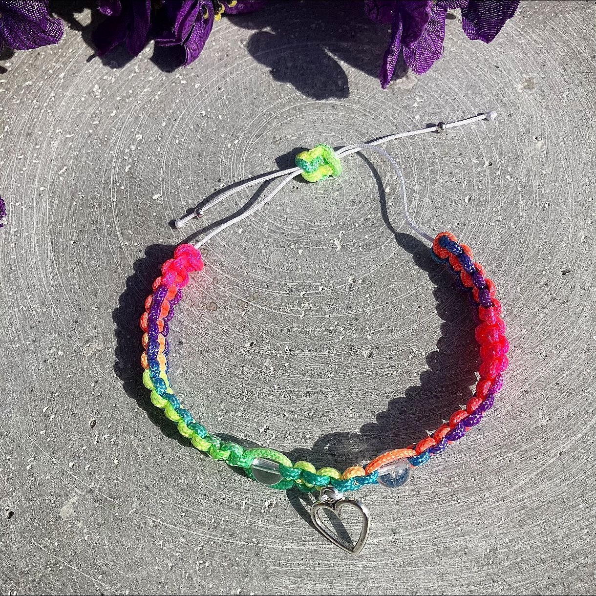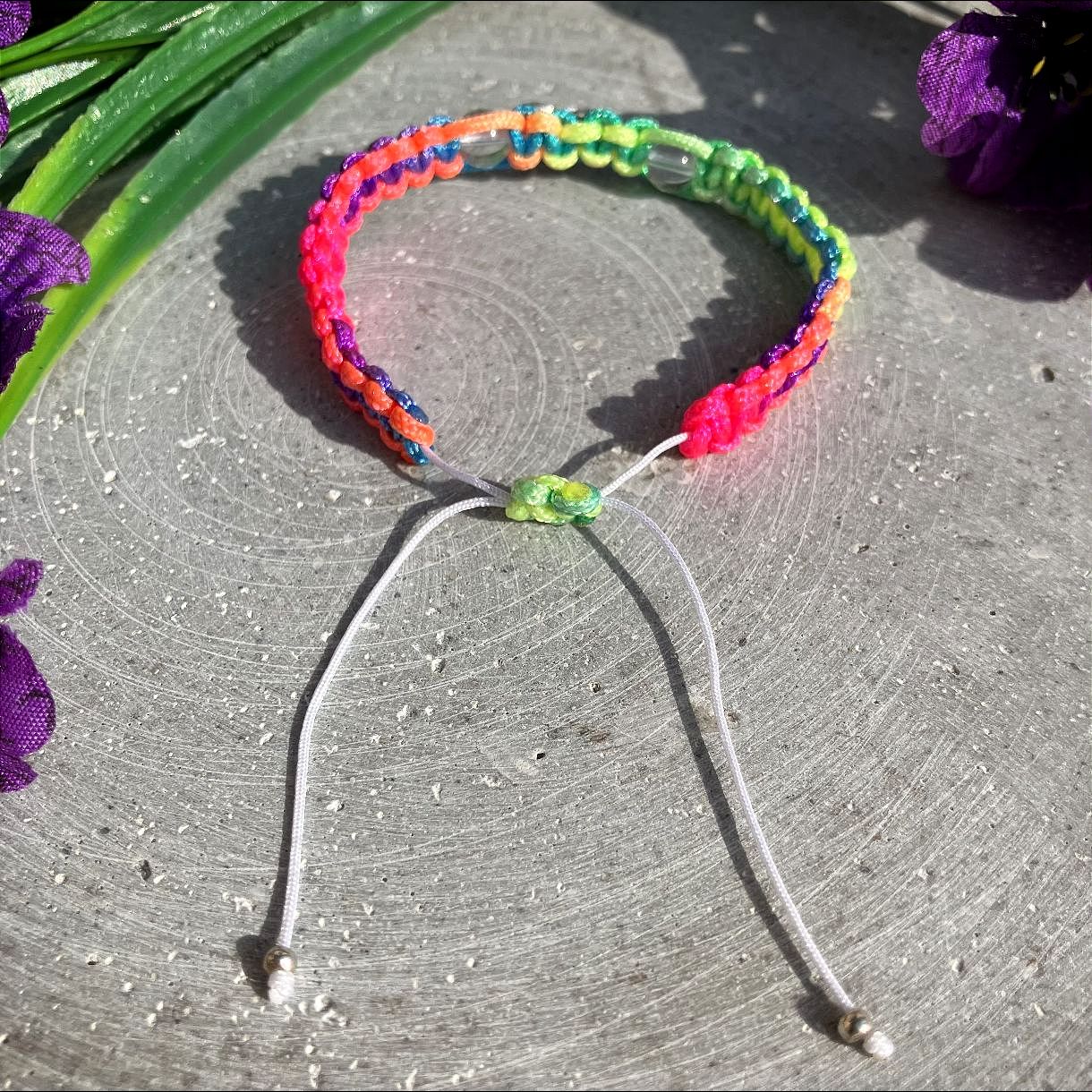 Vores regnbuefarvede knyttet armbånd fanger øjet med sin livlige palet af farver, der symboliserer glæde og mangfoldighed. Den bløde knyttesnor er vævet i en strålende regnbue af nuancer, der skaber en festlig og positiv energi.