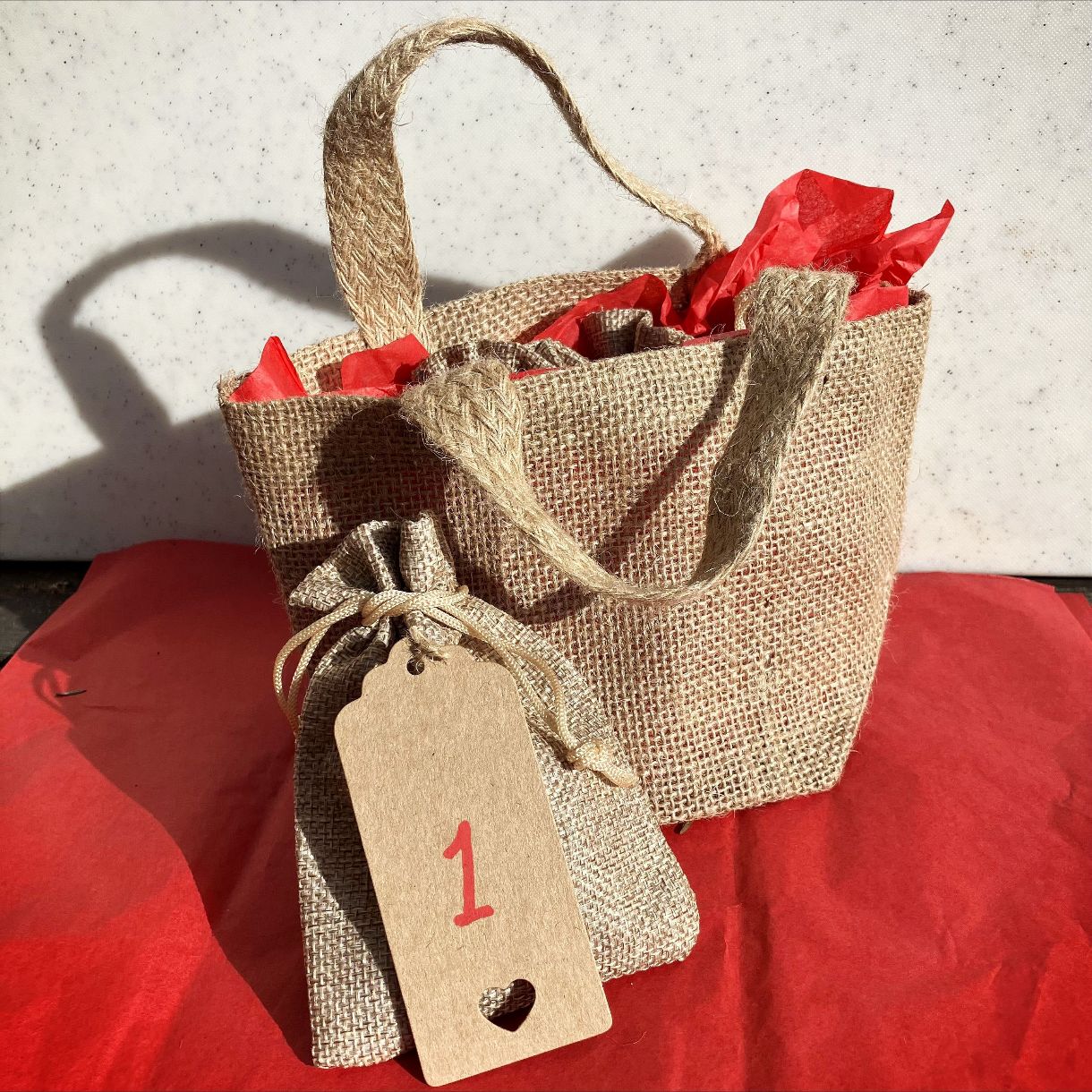 Alt er samlet i en lille hørpose (ca. 13 x 20 x 12 cm), som indeholder de fire små adventsposer (ca. 12,5 x 8,5 cm). Hver pose er lukket med en snor og har et udseende som en lille sæk i et materiale, der minder om hør.
